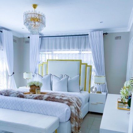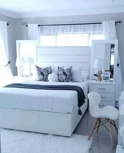 The centerpiece is typically a Grand King-Size Bed featuring an oversized, upholstered headboard in white velvet or premium faux leather, often accented with polished chrome or gold inlay. Accompanying the bed is a full suite of functional luxury: a six-drawer dresser with a matching vanity mirror, two bedside nightstands, and often a sliding-door wardrobe. Each piece is unified by “Executive-level” details, such as soft-close drawer glides, velvet-lined jewelry inserts, and recessed LED lighting, creating a seamless environment that feels airy, expensive, and meticulously organized.